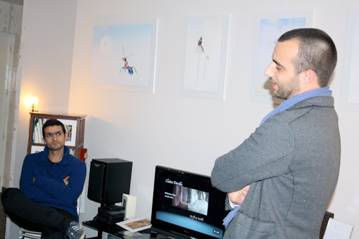 Bastien Riu en premier plan explique son travail. Les échanges avec le public et les autres artistes, ici Benjamin Nid, en second plan sont intéressants car ces arts très différents se rejoignent par les qualités d'écoute, de patience et d'osmose avec le monde environnant.