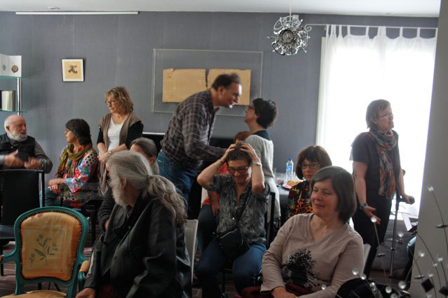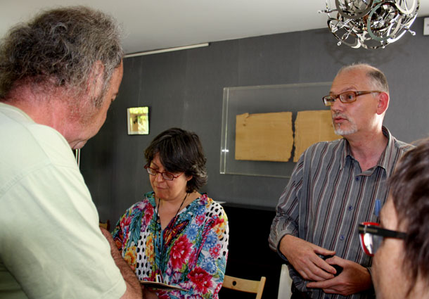![]() ![]() Discours de Jean-Pierre GEAY au vernissage de l'exposition des livres peints et gravés de sa donation à la bibliothèque municipale d'Angers en présence des artistes et des responsablesLe 20 septembre 2014, Thésée représentait l'association pour présenter le film "Habiter l'espace" dans la Médiathèque Toussaint à Angers. Ce film sur le travail du poète Jean-Pierre GEAY sera désormais aux côtés de la donation de l'ensemble de l'œuvre du poète. Une magnifique exposition d'une grande partie des livres du poète, enluminés par des artistes tels B. Alligand, Goetz, M. Dumont, J. Le Roux, P. Siché, PAB, Baltazar, Y. Mairot, Deyrolle... pour n'en citer que quelques uns occupe l'espace de la bibliothèque pour une durée de 4 mois. Le film est mis à disposition du public sur grand écran en complément des vitrines et panneaux explicatifs. Après le vernissage le 19 septembre, un colloque international permettait d'appréhender différents aspects de l'œuvre du poète et critique d'art. Des artistes ayant travaillé avec Jean-Pierre Geay étaient présents l'après-midi pour témoigner de leur diversité dans les rapports aux œuvres réalisées depuis une quarantaine d'années. Daniel Leuwers, critique d'art émérite et Marc-Edouard Gautier, conservateur chargé des fonds patrimoniaux à la médiathèque Toussaint présidaient le colloque. Photos : © Loïc Cauchy ©Marie-Jeanne Faravel ©Françoise Giraud ©Thésée Sophie Philipe exposait ses estampes numériques, travail subtil de dessins sur un papier très particulier, ensemble repris de façon numérique en vue de la réalisation d'estampes numériques respectant une charte qui garantit la qualité d'impression et la numérotation des œuvres.Ci-dessus Sophie Philippe et l'une de ses œuvres. Pour voir l'exposition aller sur la Galerie d'Arthésée. 33ème rencontre ARTHESEE le 17 mai 2014 Le matin, réunion de travail avec l'éditeur Laurent Né éditions INDEX, Michel Butor, Sophie Philippe et Thierry Lambert pour la préparation de livres d'artistes A midi repas des participants et des invités au restaurant Vivaldi de Villefontaine(photos ci-contre). L'après-midi Rencontre avec un public nombreux pour la sortie du film "Signes nomades", montrant le travail d'enluminures de Thierry Lambert sur des textes de Jean-Pierre Geay. Présentation de l'exposition et du travail d'estampes numériques de Sophie Philippe Présentation de Laurent Né et Armand Dupuy qui se sont mis à la disposition des invités pour répondre de façon individuelle à leurs questions et faire partager leur passion pour les livres d'artistes dont un grand nombre étaient exposés Pour finir, une fantaisie joyeuse au vernissage: ouverture d'une bouteille (livre d'artiste) de kirsch millésimé signée Michel Butor et Thierry Lambert.